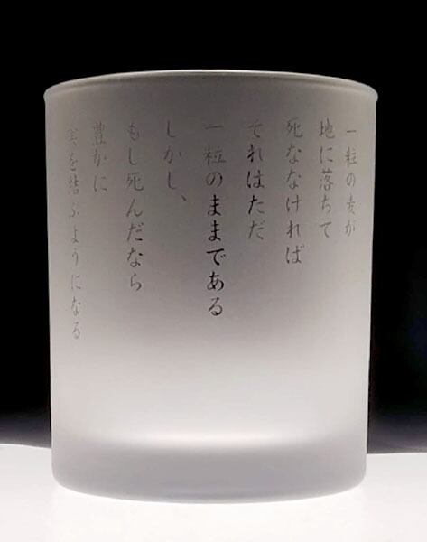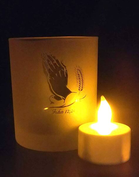 アルブレヒト・デューラーの「祈る手」をモチーフに、「一粒の麦」の句を背面に施したキャンドルグラスです。